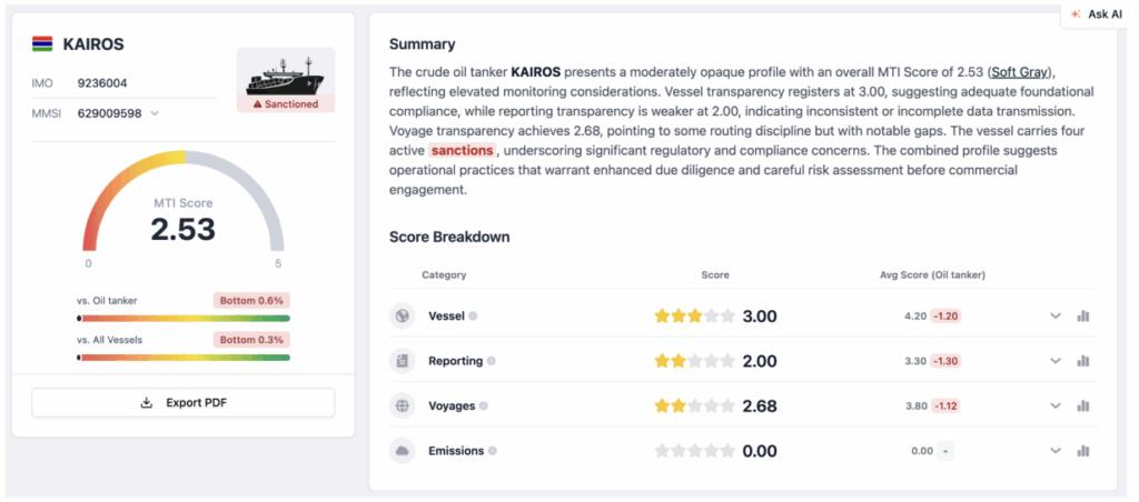 Similarly, the Kairos received an MTI score of just 2.53, driven by 13 name changes and zero AIS reportings during monitoring. Perhaps most critically, MTI flagged the vessel for five ship-to-ship operations in sensitive zones with maximum risk scores of 0.00, suggesting potential illicit transfer operations. The combination of extreme identity manipulation and high-risk operational behavior placed Kairos firmly in MTI’s highest-risk category.