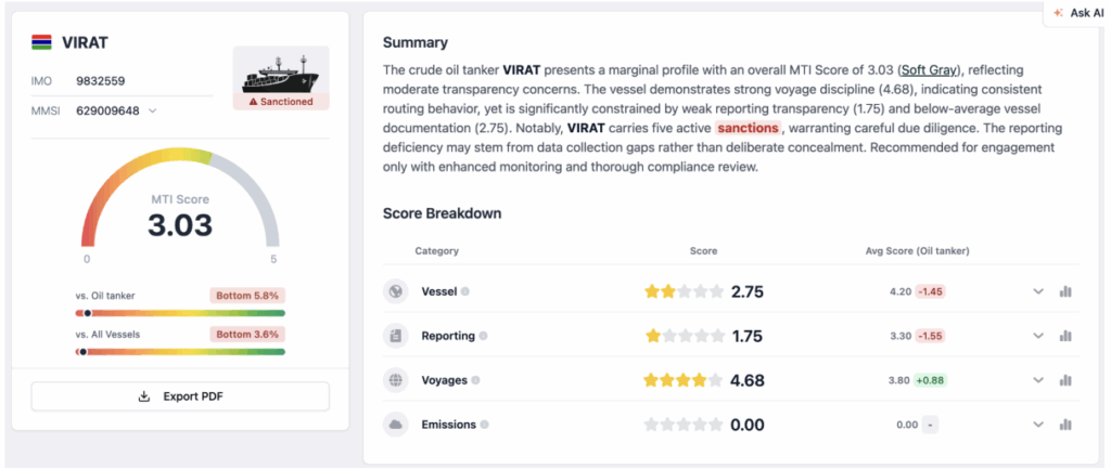 The Virat, scoring just 2.75 overall, well below the crude oil tanker category average of 4.20, displayed alarming patterns of identity obfuscation. MTI analysis documented 20 name changes (scoring 0.00, the lowest possible), four MMSI changes, three flag changes, and 50 AIS gaps averaging over 54 hours each. The vessel’s reporting score of 1.75 reflected zero AIS transmissions during observation periods, indicating deliberate efforts to evade detection. These metrics painted a clear picture of a vessel operating in the shadows.